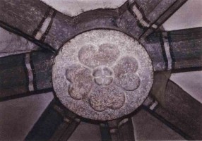 Der Gewölbeschlussstein in der Kellberger Kirche zeigt die extremste Ausbildung: herzförmige Blätter, die Samenkapsel viergeteilt, ohne Stiel und ohne Dreiberg.