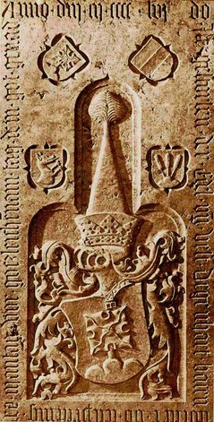Epitaph von Degenhart I. von Watzmannsdorf + 1456, oben links das Wappen seines Vaters Christian, rechts das seiner Mutter (geb. Satelbogen), darunter das Wappen seiner ersten Ehefrau Amalia Mörmosen, links das seiner zweiten Ehefrau Katharina Herleinsberg