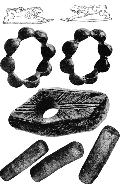 Römischer Bronzelöwe, „Henkelzierstück“, 2. Jahrhundert n. Chr., beidseitige Zeichnung; „Hohlbuckel-Armreifen“ aus dem Grab einer Keltin an der Erlaumündung, 300 v. Chr.;