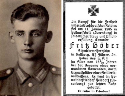 Und als ich die Frage nach der geplanten Nachfolge stellte, wurden die Augen von Rosa feucht. Rosa hatte einen etwas älteren Bruder, den Fritz. Friedrich hieß er, wie sein Großvater. Als im Dritten Reich 1944 für ihn die Zeit des Einberufungsbefehls kam, beantragte der Schmied für seinen Sohn gegen dessen Willen beim Bürgermeister, der zugleich NS-Ortsgruppenleiter war, und beim Kreisleiter, heute würde man sagen Landrat, zweimal hintereinander eine Zurückstellung, da er seinen Sohn zur Herstellung von Werkzeugen für die kriegswichtige Landwirtschaft benötigte. Zweimal wurde Fritz zurückgestellt. Fritz sah, dass seine Kameraden alle einberufen wurden, und er wollte nicht zurückstehen. Dann ging Fritz selber zum Bürgermeister und beantragte seine Einberufung zur Wehrmacht. So wurde er mit 18 Jahren einberufen. Ein halbes Jahr später fiel er.