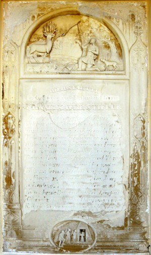 Durch 150 Jahre Verwitterung hat die Bild- und die Text-Reliefplatte sehr gelitten. Im oberen Feld ist die Hubertuslegende dargestellt. Hubertus kniet in antiker Jagdkleidung mit umgegürtetem Hirschfänger vor dem kreuztragenden Hirschen. Vor Hubertus liegen Helm, Bogen und Köcher. Hinter Hubertus lauert in Sprungstellung sein Jagdhund.