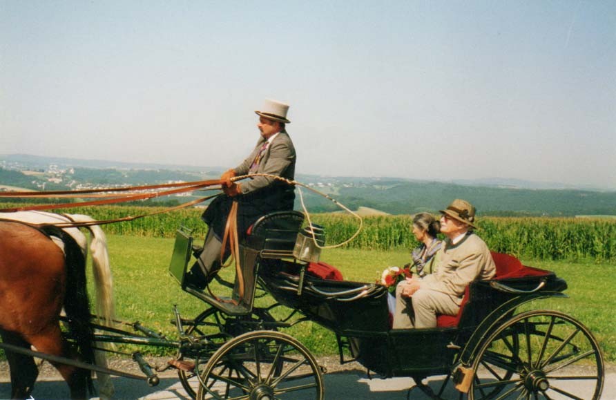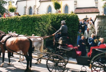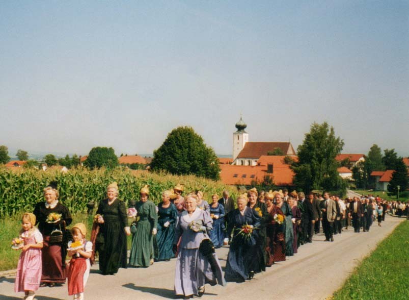 10:00 Kirchenauszug und Aufstellung zum Festzug; die Wittelsbacher wurden in der Viererzug-Kutsche Kraus-Fischer aus dem Rottal gefahren.