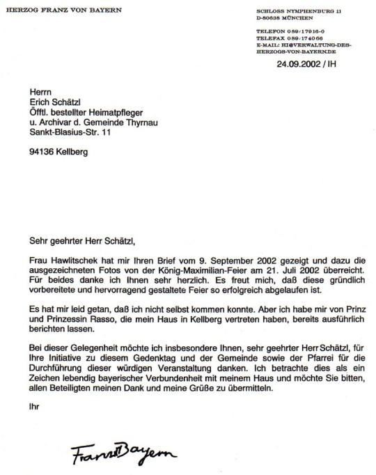 nach der Heimkehr des Prinzenpaares Schreiben des Herzogs Franz von Bayern, Chef des Hauses Wittelsbach, an die Festorganisatoren