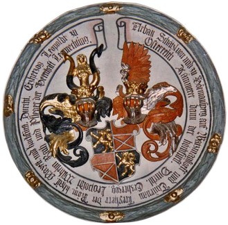 Das hölzerne, runde, viergeteilte Allianzwappen in den Farben Schwarz-Gold ist von einem Lorbeerkranz umschlossen und trägt die Inschrift: